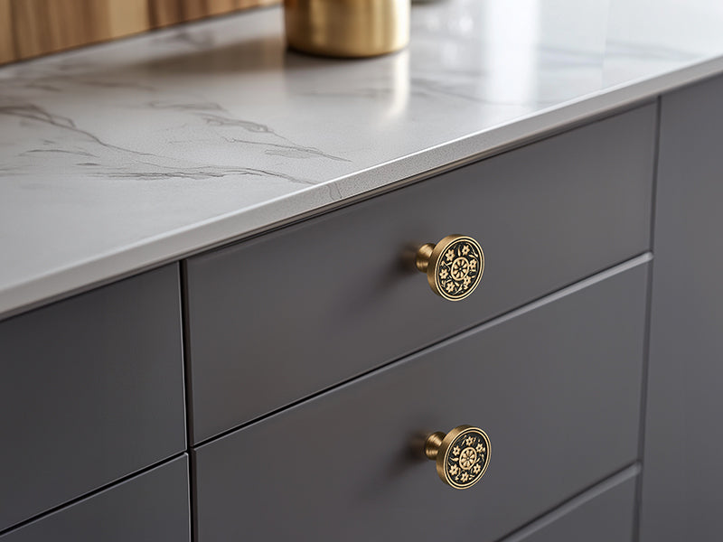 - Unique Carved Texture & Brushed Gold Finish: Each knob features a delicately engraved concentric swirl pattern and brushed brass surface, offering a perfect balance between vintage charm and modern sophistication, while resisting fingerprints and oxidation