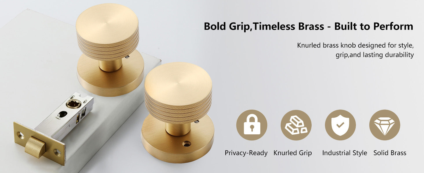 Knurled Brass Passage Door Knob – Industrial Style Grip Handle, Solid Brass Build, Brushed Finish – Fixed 70mm Backset for Hallway & Closet (Brushed Brass, Passage-2.75 in)