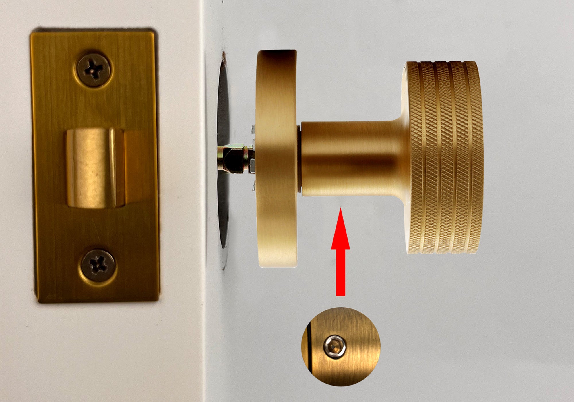 Before inserting the spindle, please use the included hex key to loosen the small screw at the bottom of the knob. Then push the spindle through and tighten the screw again to secure it. This step ensures smooth rotation, proper function, and allows the knob to sit flush against the door.